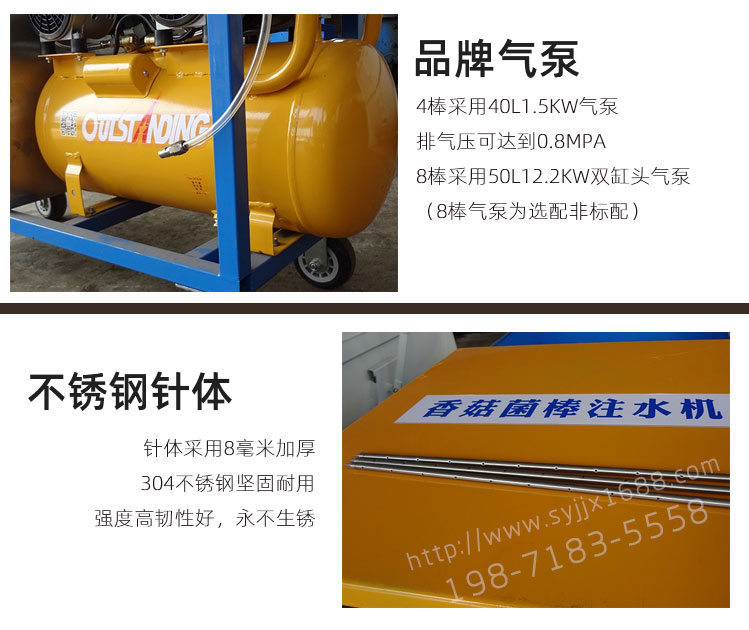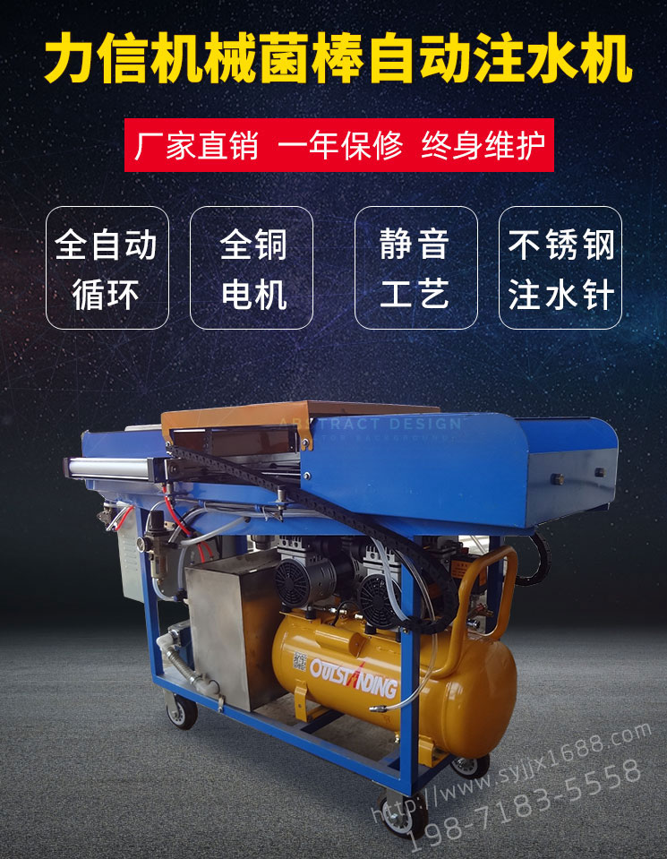 香菇菌棒注水機機型特點 :可回收水,對供水壓力和水源無特殊要求,注水量可根據客戶技術要求,定時定量隨用隨調,全新雙頭8棒循環注水模式,注水效率提高一倍,四面防濺防漏水,水回收利用率達到90%以上,高比例的循環回收水功能可有效節約用水,降低棚內排濕難度,避免爛棒,可以在水源中按比例加入營養素有效提高香菇品質和產量。